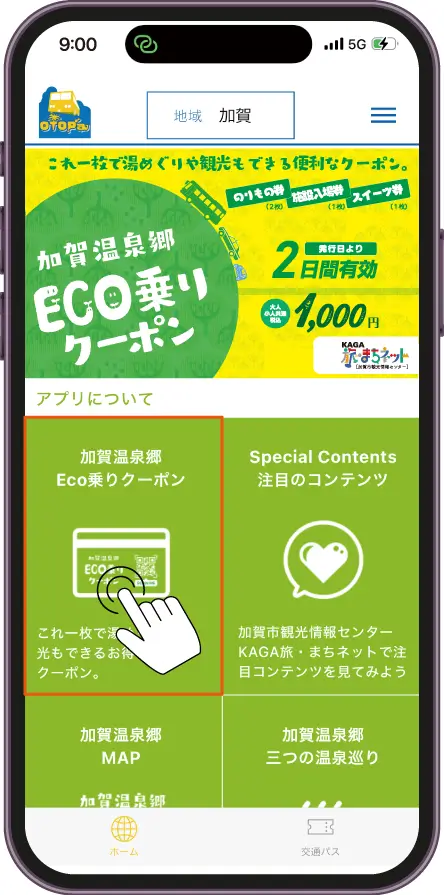 OTOPaアプリの地域トップページ「加賀」の「加賀温泉第ECO乗りクーポン」をタップします。