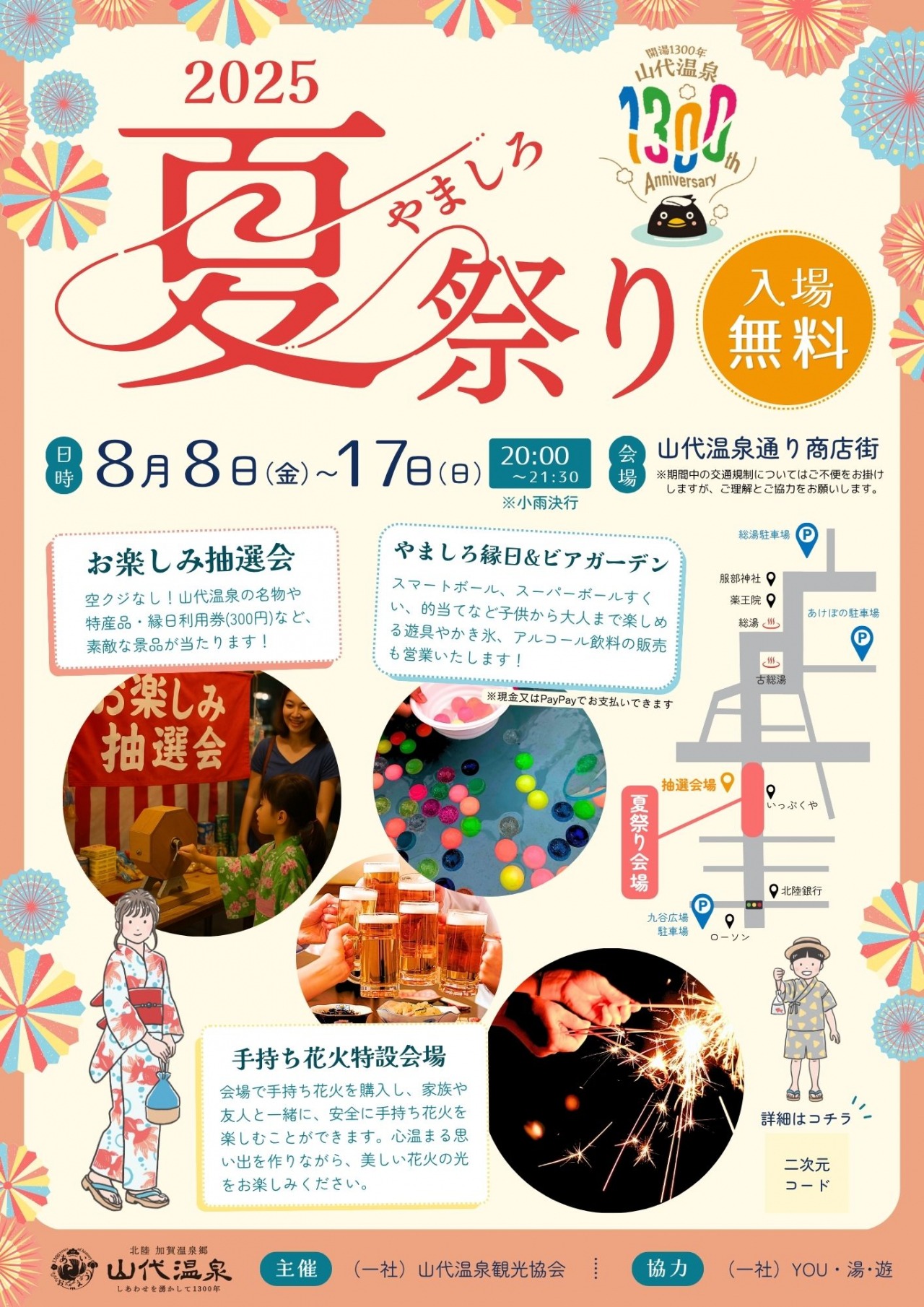 山代温泉で夏を満喫! 2025.07.22 新着情報 8/2(土)・3(日) 山代大田楽 8/2(土)・3(日) 万松園通りホコ天 8/8(金)~8/17(日) やましろ夏まつり 8/8(金)・9(土) 山代スマートパークビアガーデン Loading...