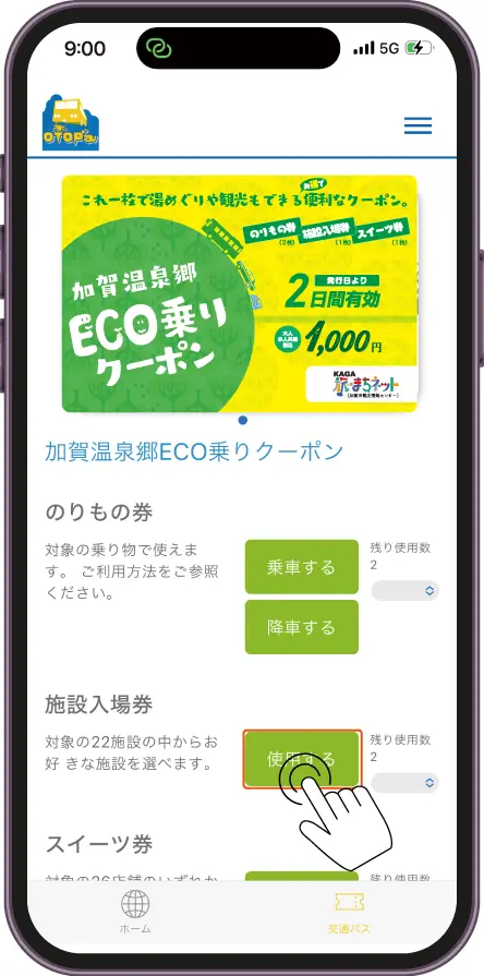 OTOPaアプリの地域トップページ「加賀」の「加賀温泉第ECO乗りクーポン」をタップします。