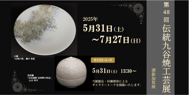 - 日本最大で最高品質の古九谷コレクションを誇る石川県立美術館から、古九谷の大作・名品を厳選し、展示します。石川県指定文化財の全7件(うち1件は、かつ「重要美術品」)が網羅展示され、他館独自による館外展示では初となります。(公式サイトより転載)