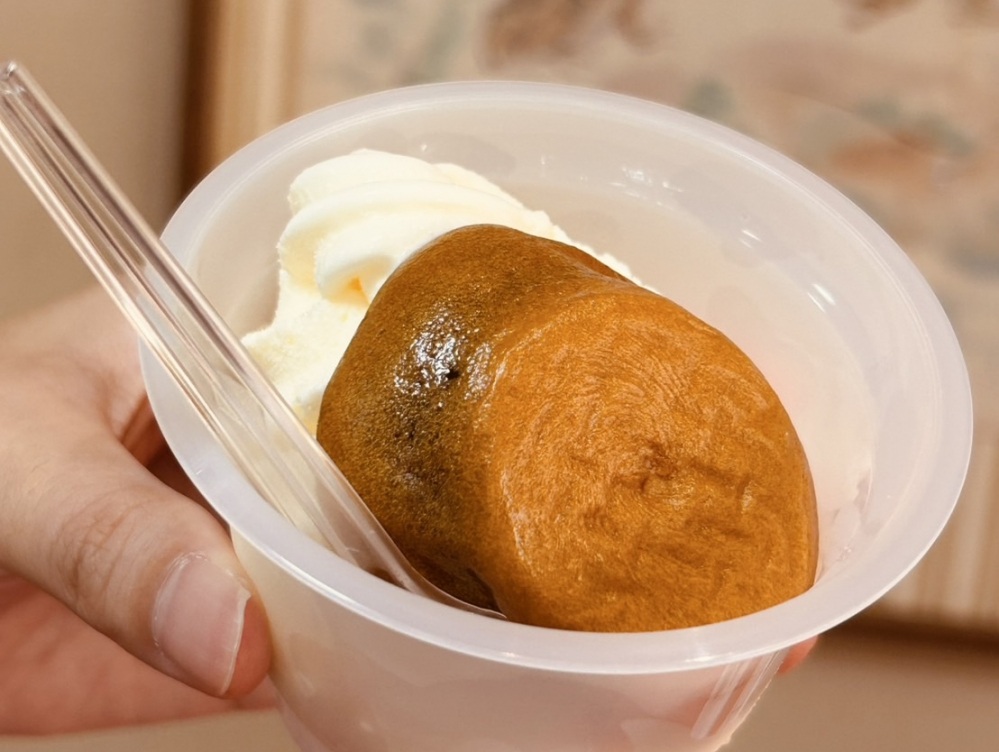 娘娘万頭のあんことソフトクリームを一緒に味わう新感覚スイーツ。
