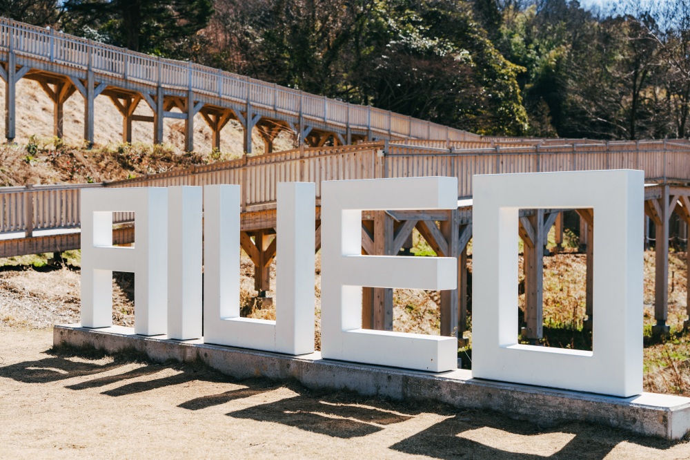 木々に囲まれた静かな空間に点在する、ひらがなのオブジェ。