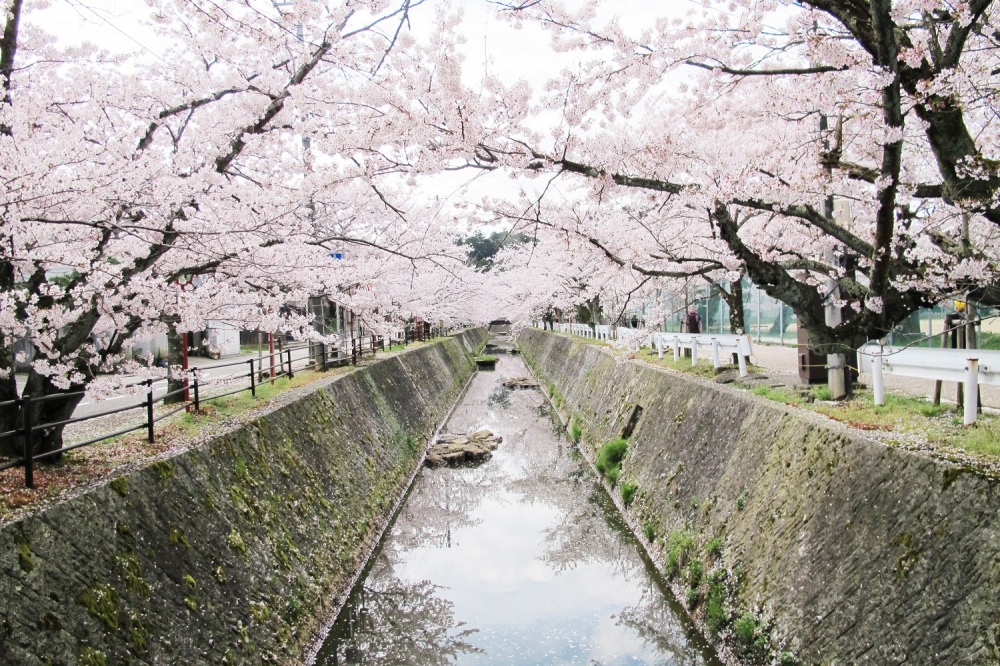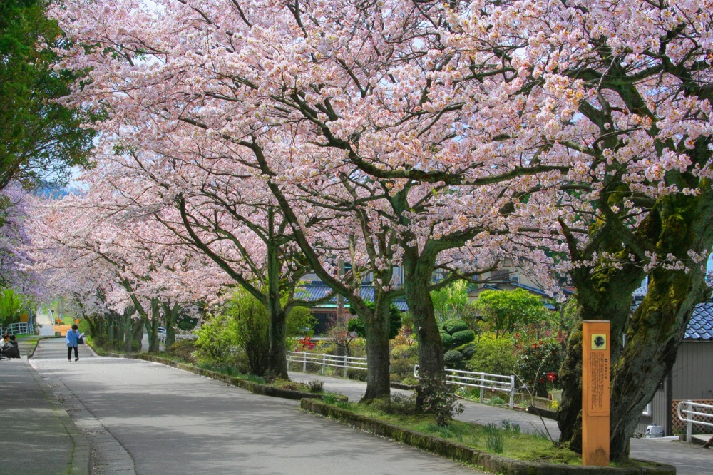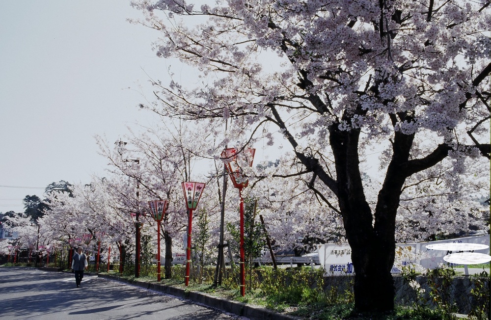 延長約1㎞に渡って約200本の桜が咲き乱れます。開花中の夜間はぼんぼりも灯され、しっとりと花見が楽しめると地元の人たちからも人気なスポットです。近くには、山の下寺院群・石川県九谷焼美術館・深田久弥山の文化館・江沼神社・長流亭などの見どころもあります。