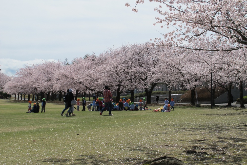 JR加賀温泉駅と大聖寺駅の中間、加賀市の中央に位置し、緑豊かな加賀平野、霊峰白山を一望できる公園です。芝生の広場やお城の滑り台付近など、公園内の至るところに美しい桜が咲き誇ります。