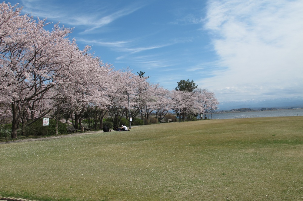 桜と、柴山潟越しに望む白山を同時に楽しむ