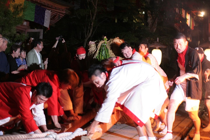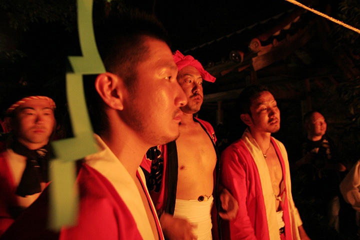 柴燈護摩の祈祷が終わると、紅白の法被を着た精悍な貌(かお)の若衆が、威勢の良い掛け声と共に、八俵の菖蒲俵を括り付けた「菖蒲みこし」を担いで、境内で揉み合い、修験者が吹く法螺貝の音と高張提灯を先頭に、街へと繰り出します。神輿が温泉街を一巡する内に、菖蒲の詰まった俵は路上でズタズタに揉みくだかれてゆきます。