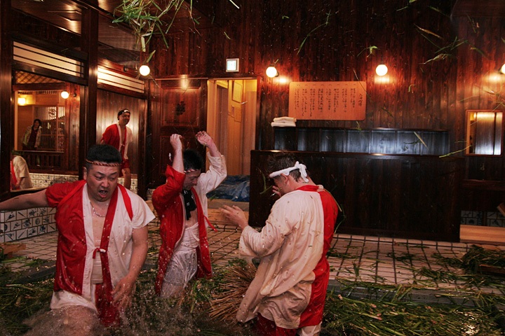 そして、破れた俵から菖蒲が路上に散乱すると、若衆は、その俵を奪い合い、拍子木を鳴らして「古総湯」の湯壺に投げ込み、我先にと湯に飛び込んでいきます。