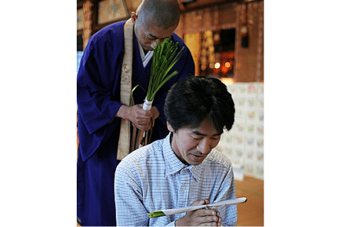 加賀 山代温泉の「菖蒲湯まつり」は、柴燈護摩(さいとうごま:野外で行う護摩法要)から始まります。山伏姿の修験者が、境内に設けられた護摩壇の四方を清めた後、火を点け、心願成就の祈りを込めた「護摩木」を、読経と共に投げ入れます。