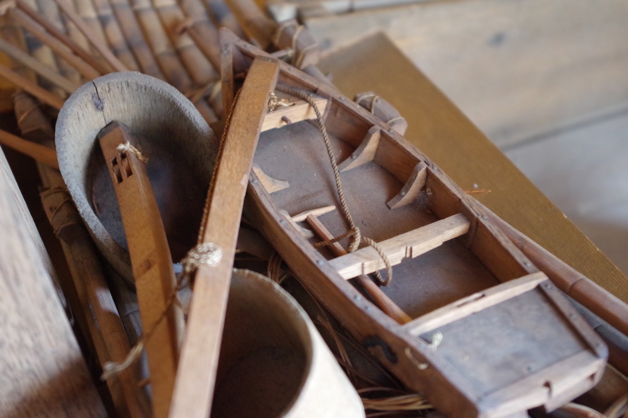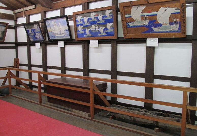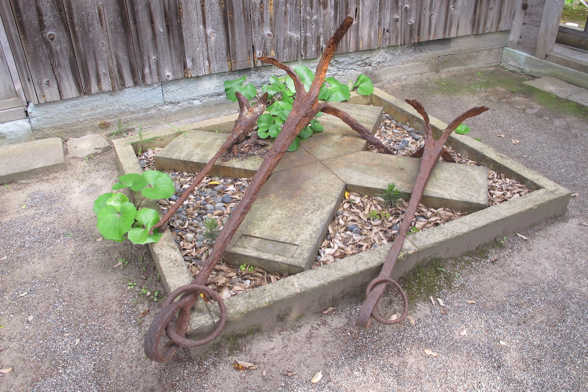 航海を終わった北前船は、最後の荷揚げをしてから、淀川の下流、木津川口につないでおきました。それは、船板に穴をあける船くい虫が、川水(淡水)にはいないからです。今でも橋立の船主宅には古い船板を利用した外壁をみることができます。よく見ると、その板には船くい虫のあけた丸い穴がポツポツとあいています。