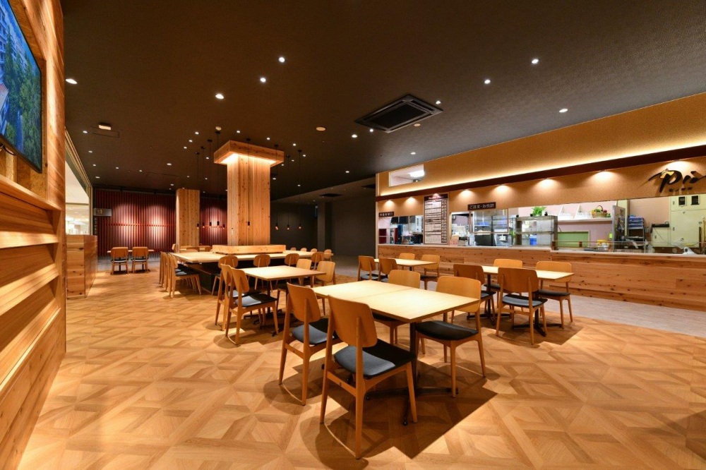 加賀温泉駅に隣接するアビオシティ加賀の1Fにあるフードコートがリニューアルして「加賀食テラス」に。テレワークや電車の待ち時間に立ち寄れるよう、無料Wi−Fiやコンセントを整備され、多目的スペースとなっています。温かみのある空間にするため、柱には天然木を使用。壁の一部には新幹線駅の外観にあしらわれる予定の、加賀の古い町並みに残されている紅殻(べんがら)格子を使っています。