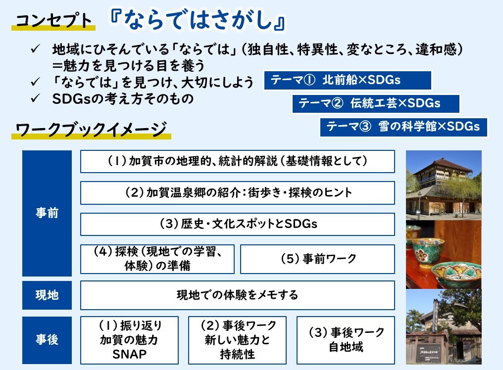 加賀市への旅行で感じたことや気づいたこと、考えたことを踏まえながら、SDGsを自分事としてとらえられるようなワークブックになっています。