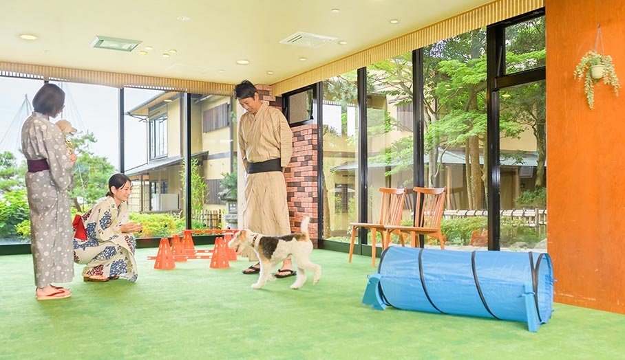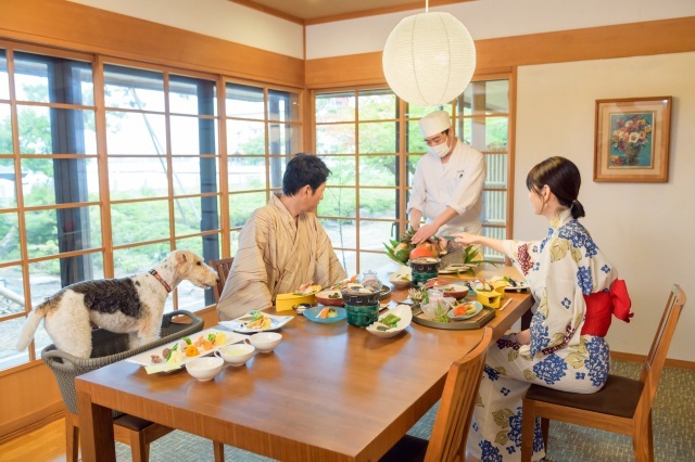 ペット同伴可能な宿があるのも加賀温泉郷の魅力です。広々とした客室は畳仕様で、愛犬がストレスなく快適に過ごせる設計となっており、一緒に入浴できる露天風呂も完備されています。愛犬と気兼ねなく過ごすことのできる宿は全国でも数が少なく、その希少性からも人気があります。