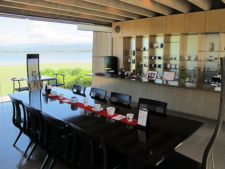 世界的な建築家、磯崎新(いそざきあらた―バルセロナオリンピックメイン会場設計)が設計したティールームは、目の前に水面きらめく柴山潟、遠方には白山が広がるガラス張りのアーティスティックな空間が来る人の心をホッと和ませます。