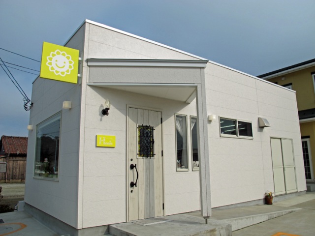 白い建物に黄色い看板が目印です。