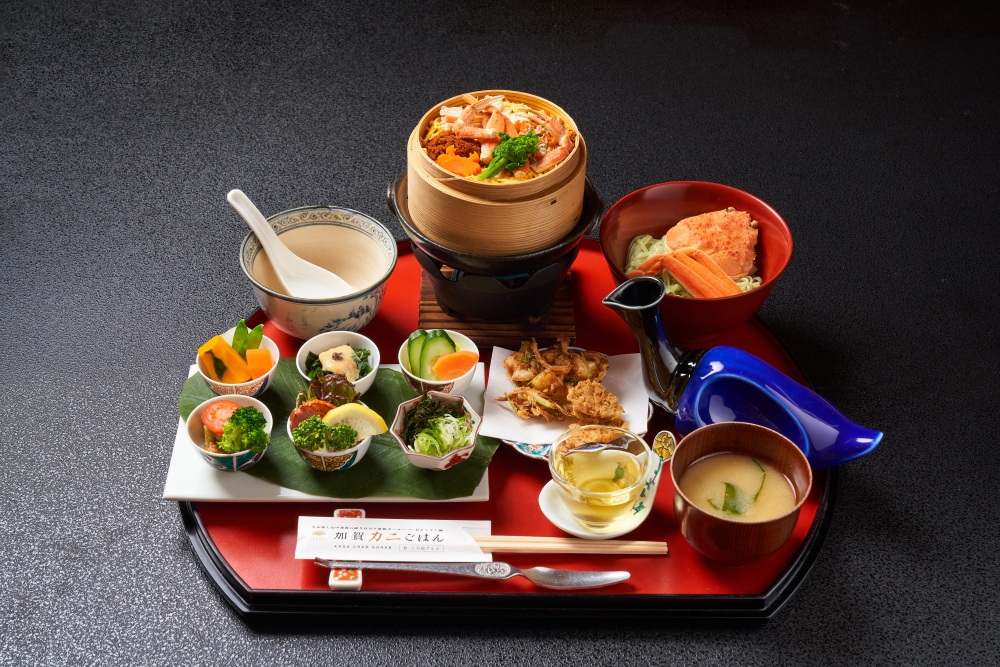 加賀温泉郷は、橋立港で水揚げされる加能ガニや貴重な野生の鴨肉「坂網鴨(さかあみがも)」など、ここでしか味わえない美食が豊富です。ご当地グルメでは、香箱ガニ(雌のズワイガニ)を1杯使った「加賀カニごはん」が楽しめます。器には九谷焼と山中漆器が使われ、メインの「カニごはん」や旬の野菜や魚を使った小鉢5品、味噌汁や加賀棒茶など、ご馳走が盛りだくさんのプレミアムな食事を満喫できます。