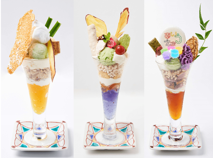 「加賀パフェ」は、同じく九谷焼と山中漆器を使って提供するご当地スイーツです。ゼリーやはちみつ生クリーム、野菜スポンジケーキなど地元食材をふんだんに使用した色鮮やかなパフェで、ブロッコリー・味平かぼちゃなど加賀九谷野菜をトッピング。温泉地でのおやつにぜひご賞味ください。