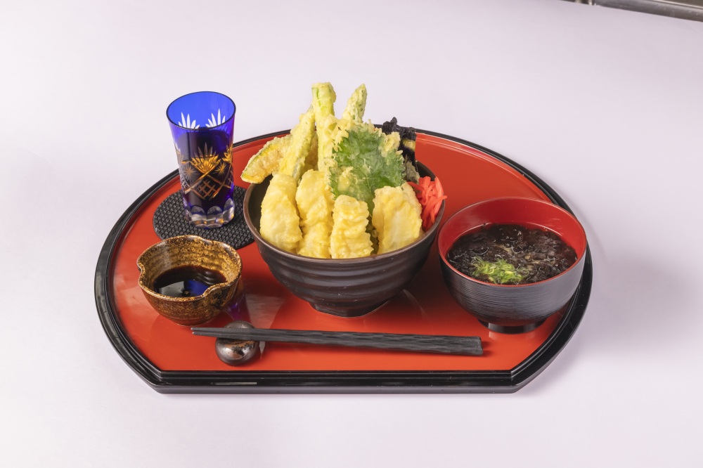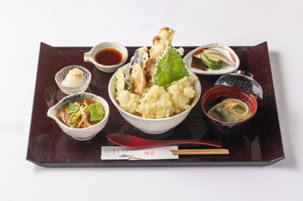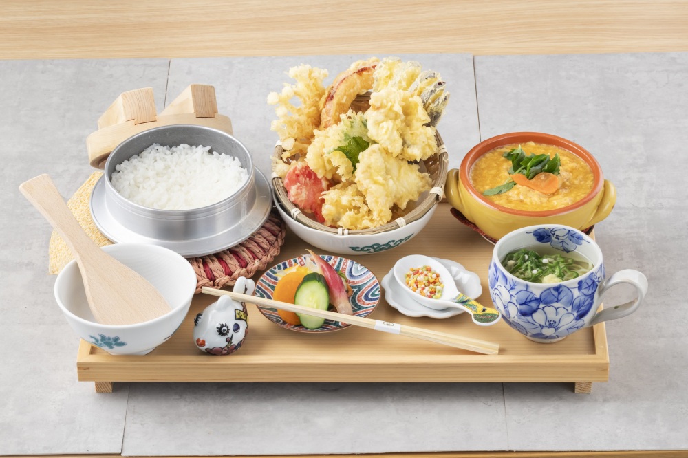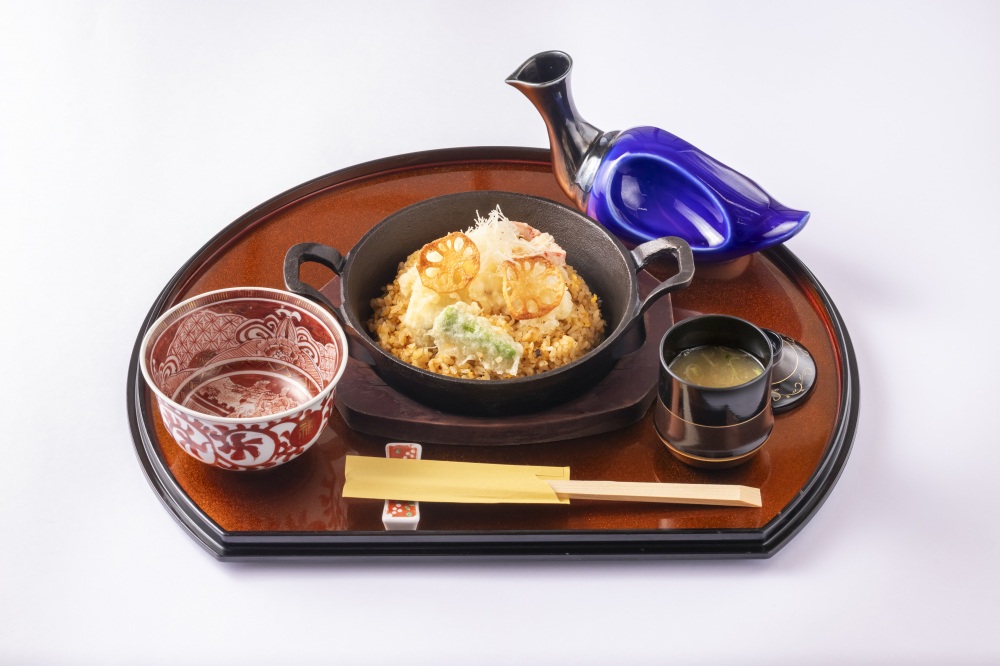 ふぐ天と季節の加賀野菜をふんだんに盛り合わせた天ぷらが味わえる大ボリュームの加賀ふぐ天めし。