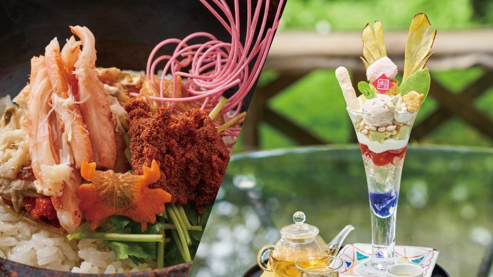 加賀市に来たら、九谷焼と山中漆器の器に盛り付けられた香箱ガニ(雌ズワイガニ)おもてなし膳「加賀カニごはん」と地産地消5層パフェ「加賀パフェ」をぜひ!