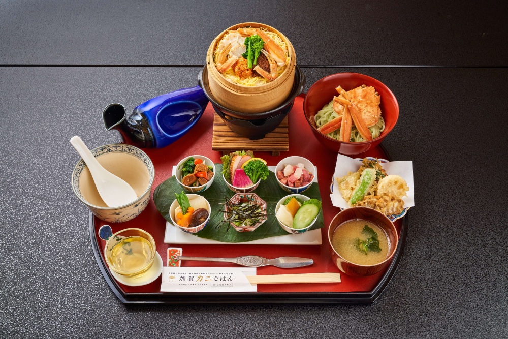 貴重な香箱ガニ(雌のズワイガニ)を一杯(一匹)使った各店こだわりの「カニごはん」に、旬の野菜や魚を使った小鉢五品、味噌汁、献上加賀棒茶が付いた、加賀市ならではの上品なOMOTENASHIカニごはん膳。