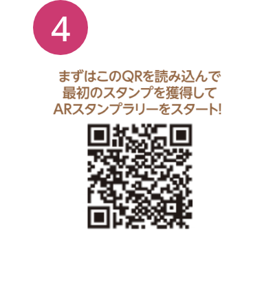 マップ上(チラシ裏面)のARスタンプラリーポイントを巡って設置してあるQRを読み込むと、 ブラウザアプリが立ち上がりスマホの画面上にいろいろなAR画像が表示されます。 (一部のARポイントはチラシ記載のQRを読み込むと表示)