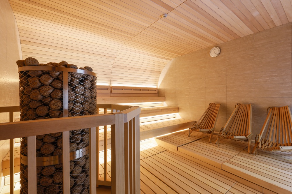 ひのきを使用した明るいサウナ室。大きめの窓を設置し外の風景も楽しめます。また、天井をR型にし、熱がサウナ室に回りやすくなるようになっており、サウナに隣接する水風呂と、ととのい椅子の間には木があり、森の中でととのっている様な体験ができます。