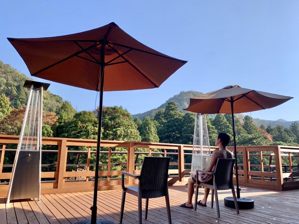 よしのや依緑園1番の特徴はサウナ専用エリア「TOTONOI」。鶴仙渓を目の前に入れる絶景サウナで汗をたっぷりかいたら、オープンテラスへ。鶴仙渓の大自然の中での外気浴はクセになる気持ち良さ! 朝は7時から利用可能なため、早起きして早朝サウナを楽しむのも良いですね。