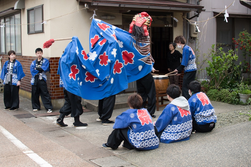大聖寺地区は、加賀市の中でも最も古く獅子舞が伝来した地区とも言われています。城下町である大聖寺は町割が細かく、十数軒で1つの獅子舞を持つ場合もあります。人口あたりの獅子舞の密度を考えると、日本有数の獅子舞が盛んな地域の1つと言えるでしょう。大聖寺地区では毎年4月第2土日に開催される「大聖寺桜まつり」で、各町の獅子舞が披露されます。地域を散歩していると、色々な街角で獅子舞に遭遇します。