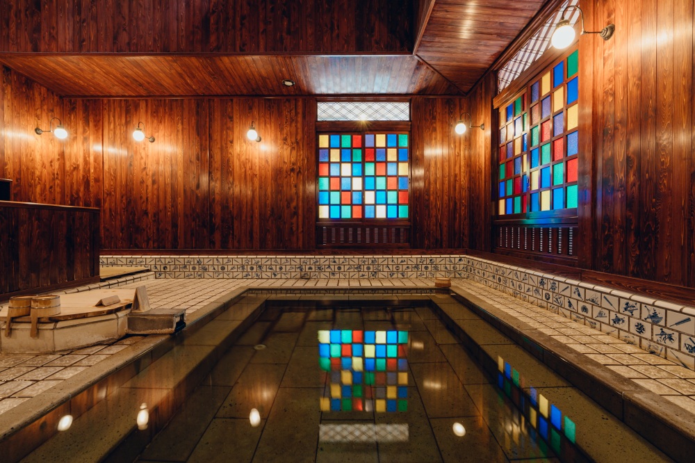 こけら葺きの屋根と二階の窓が印象的な外観、内装には当時、最先端だったステンドグラスが湯船に鮮やかな光をおとし、壁は拭き漆、タイルにはこれまた当時のままの絵柄を忠実に再現した九谷焼がほどこされています。