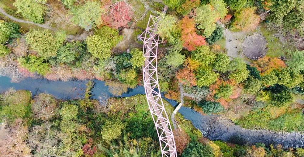 勅使河原宏氏デザインのユニークなS字型の橋で、類の無い形状と美しい紅紫色のモダンさを併せ持ちます。