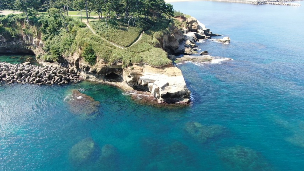源義経が、兄頼朝に追われ北陸路を奥州に落ちのびる際に同行していた尼御前が、これから先の旅路で足手まといになるのを憂えて身を投げたという伝説が残る岬。現在は峠として突き出ている部分は淡緑灰色~灰白色を呈する軽石凝灰岩の台地で、美しい松林と海岸草地に遊歩道が完備されています。この岬から北に続く千崎、塩浜の海岸は高さ5~10mの海蝕崖が発達し雄大な景観を示しています。
