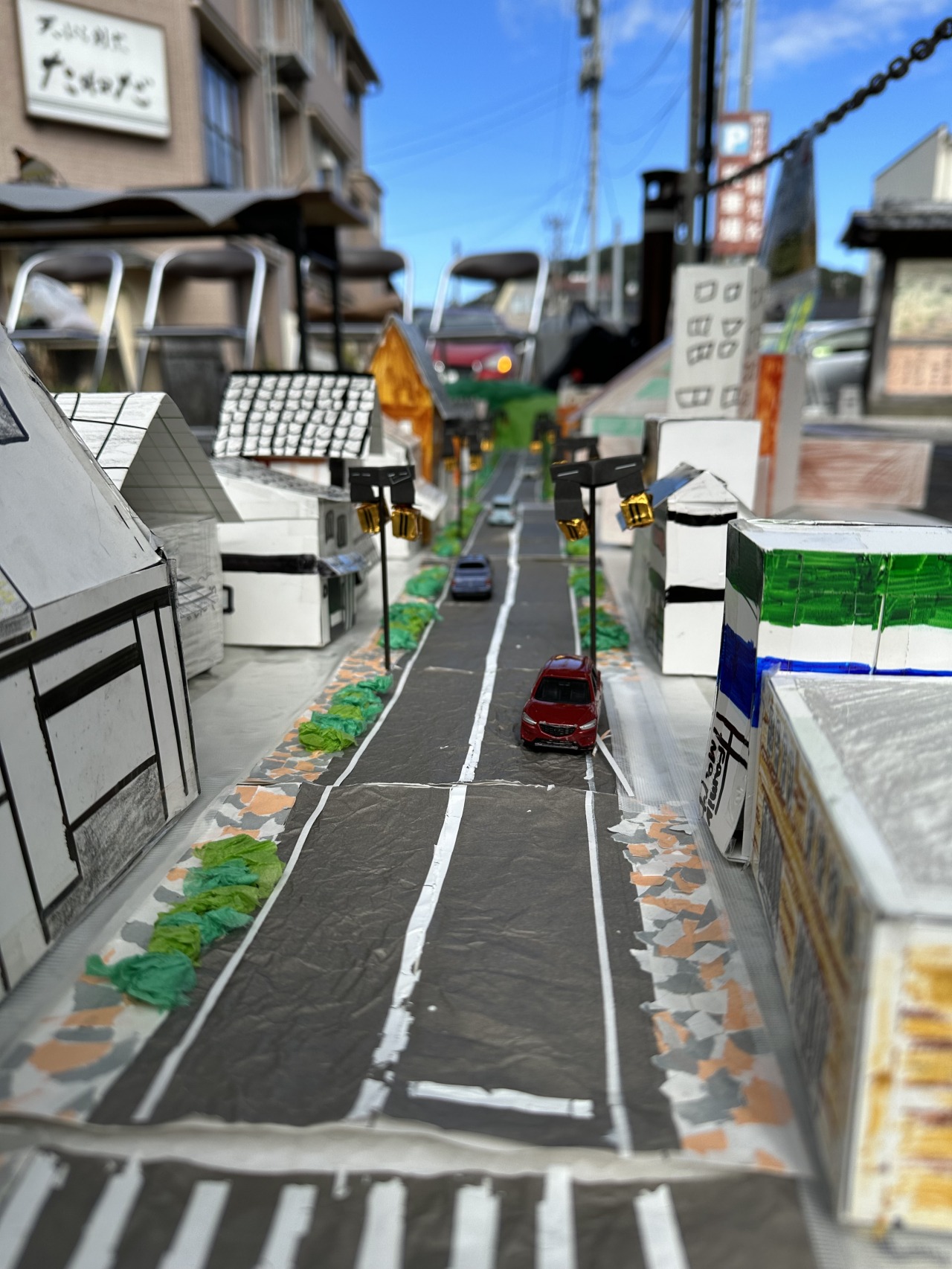 そこで出た課題をもとに、2学期は山中座で開かれたハロウィンイベントでブースを出展し、ポスターやポップ、動画などを通して、山中温泉の良さや魅力を伝えました。また、ブースでは、算数科「拡大図と縮図」で学んだことを生かして、総合や図工の時間に山中温泉ゆげ街道の1/100のジオラマも展示しました。