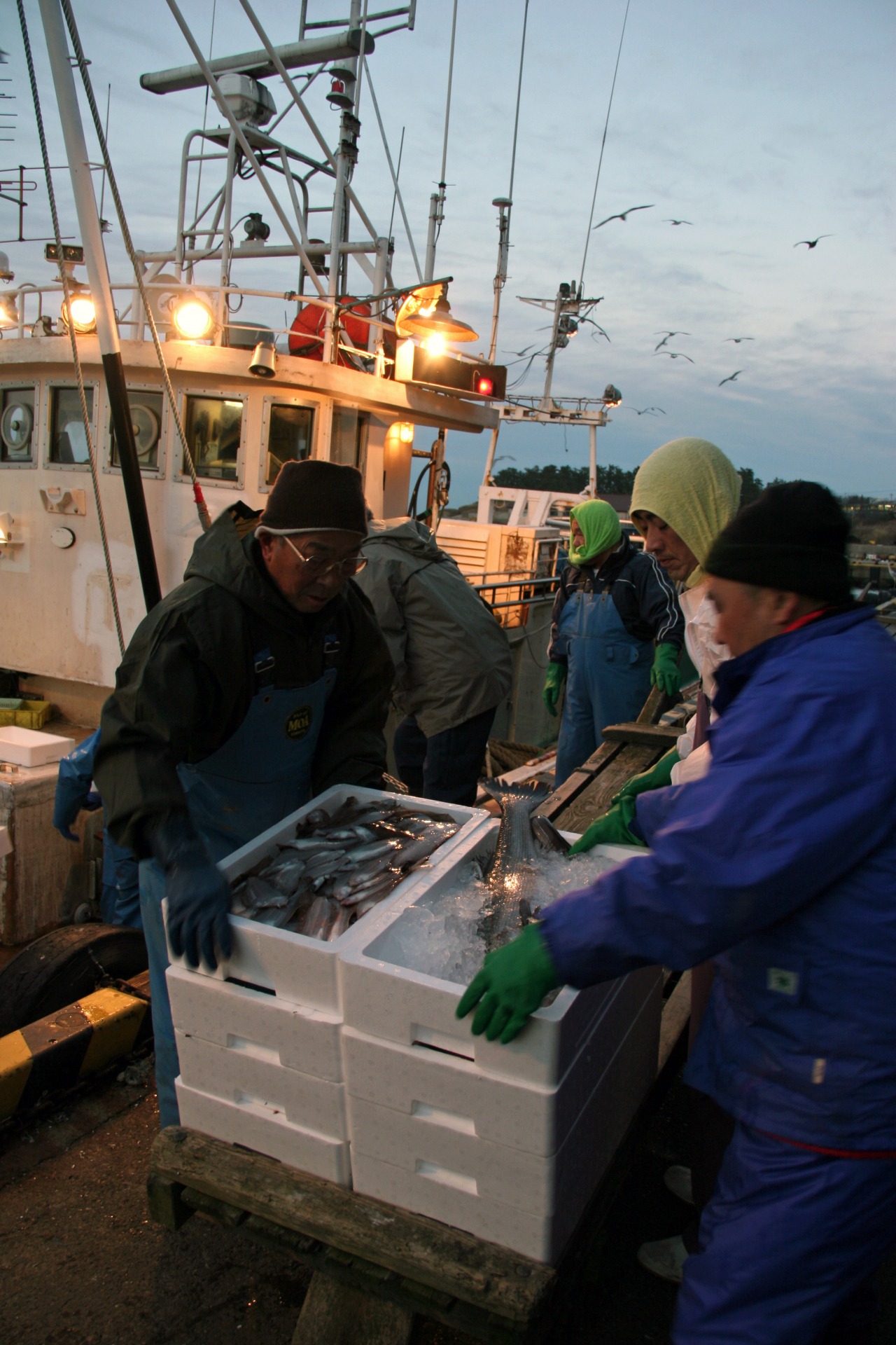 底引き網漁とは、大きな網を水深数十メートルの海底まで入れ、船で引っ張り、入った魚を水揚げする漁のこと。