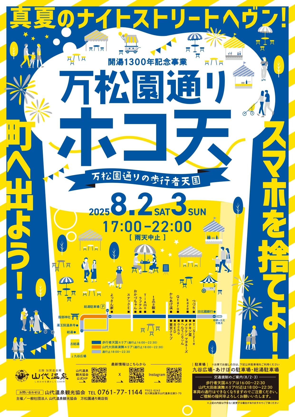 山代温泉で夏を満喫! 2025.07.22 新着情報 8/2(土)・3(日) 山代大田楽 8/2(土)・3(日) 万松園通りホコ天 8/8(金)~8/17(日) やましろ夏まつり 8/8(金)・9(土) 山代スマートパークビアガーデン Loading...