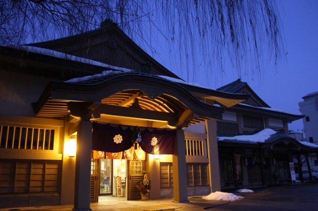山代温泉古総湯 外観 ライトアップ 雪景色