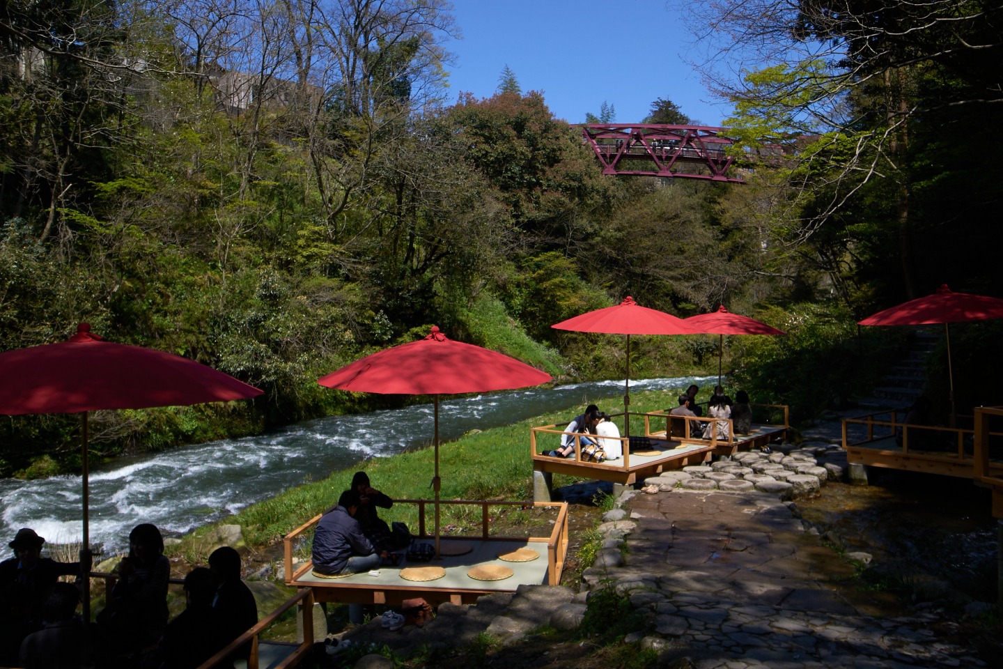 あやとりはしの袂にある鶴仙渓(かくせんけい)川床では、山中温泉出身の和の鉄人、道場六三郎レシピによる「冷製抹茶しるこ」「川床ロール」に舌鼓をうちながら、渓谷の深い緑、清らかな水の流れのなか、風雅なひとときをお楽しみいただけます。また、食べ物やお飲み物の持ち込みも可能(アルコール類は除く)で、参加旅館や町のお店でご予約・テイクアウトしたお弁当(川床弁当)をお召し上がりいただくこともできます。