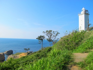 加賀海岸で最も日本海に突き出した岬で、白亜の灯台と青い海が美しいコントラストを描いています。