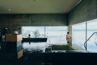 世界的建築家 谷口吉生氏の設計で、外観はそのほとんどがガラス張り。柴山潟、空、森など周辺の自然に溶 け込み、建物からは雄大な白山連峰を背景とした美しい柴山潟の眺望が楽しめます。 窓から水平線のように広がる柴山潟の湖面と浴槽が一体化し、さながら柴山潟に浸かっているような感覚を覚える解放感漂う「潟の湯」と、緑広がる優しい森の景色に安らぎを感じることのできる癒しの空間「森の湯」の2つの浴室があり、定期的に男女を入れ替えてご利用いただきます。