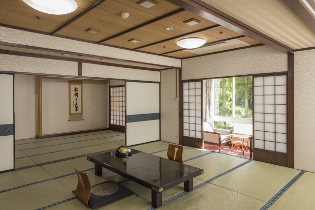 ロビーから滝が流れる屋上庭園が眺められ、遠くには四季折々の美しい山々が見渡せます。 お風呂は総ひのき造り露天風呂に浸かりながら身も心もリフレッシュ。