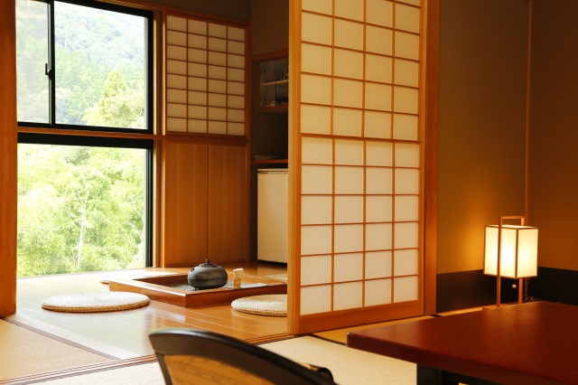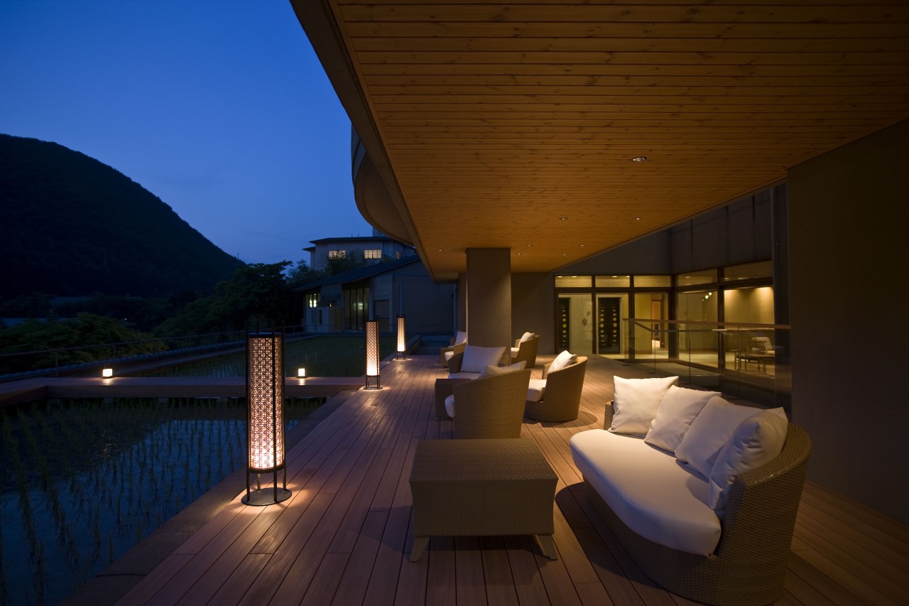 ロビー前庭に田んぼテラスを作り、稲を育てています。 八十八は米の字をモチーフにしており、厨は厨房を意味します。 カウンター席を中央に設けたオープン厨房の個室料亭街では出来たての料理を味わっていただききます。 食とおもてなしを大切にしたこだわりの宿です。