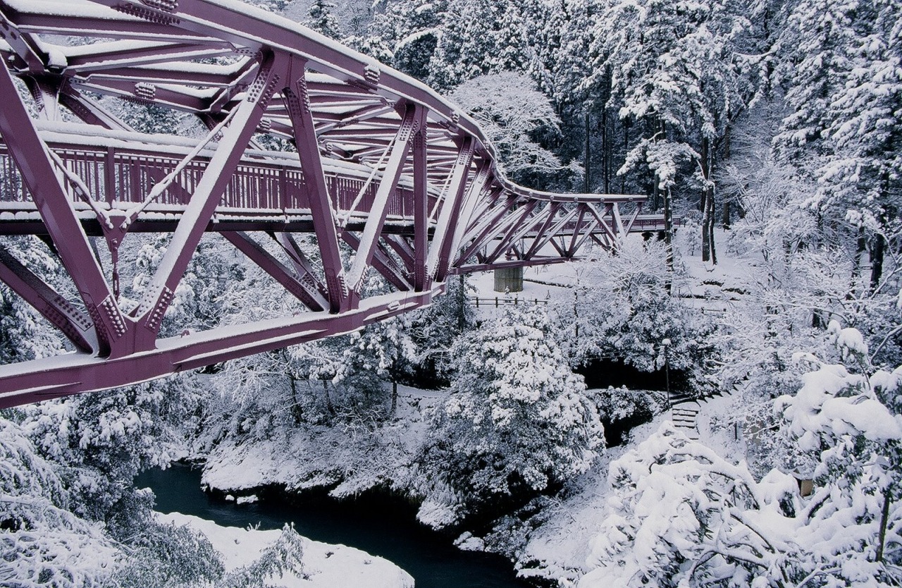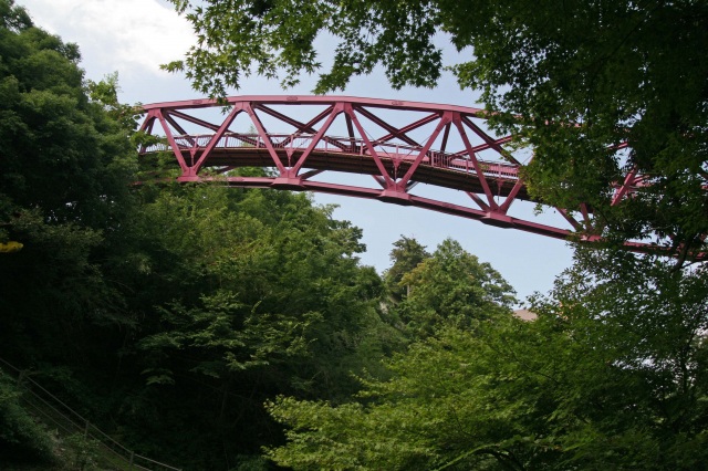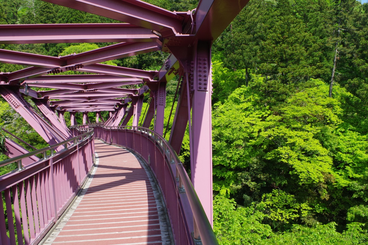 勅使河原宏氏デザインのユニークなS字型の橋で、類の無い形状と美しい紅紫色のモダンさを併せ持ちます。