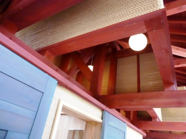あいおすふれあい広場は山中温泉今立町にあり、加賀東谷地区の玄関口に位置します。加賀東谷地区に訪れた方のトイレを含めた休憩所として利用していただくことを目的として建てられ、お祭りなどのイベントの際には地元の住民との交流の場としても活用されています。 建物は加賀東谷の建物にあわせた木造建築で、赤瓦の屋根や土壁などを用いた構造になっています。 また、天井の代わりに側面のみに麻縄を巻いた箱を配置しました。換気を良くし、地元の人と他から来る人とのふれあいが生まれやすいようになっています。