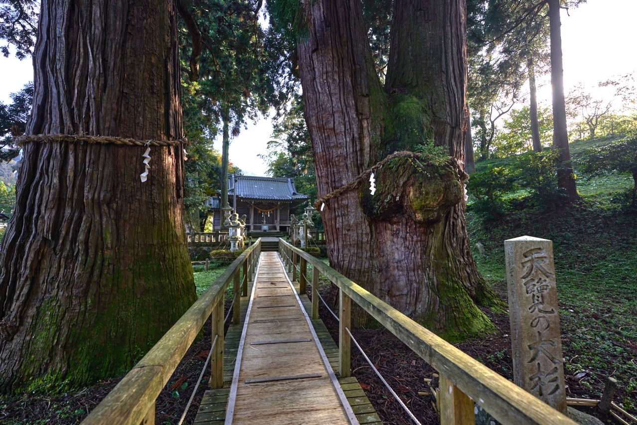 温泉街から南へ約2kmの菅原神社の境内にある樹齢2300年と言い伝えられている御神木で、国の天然記念物にも指定されています。