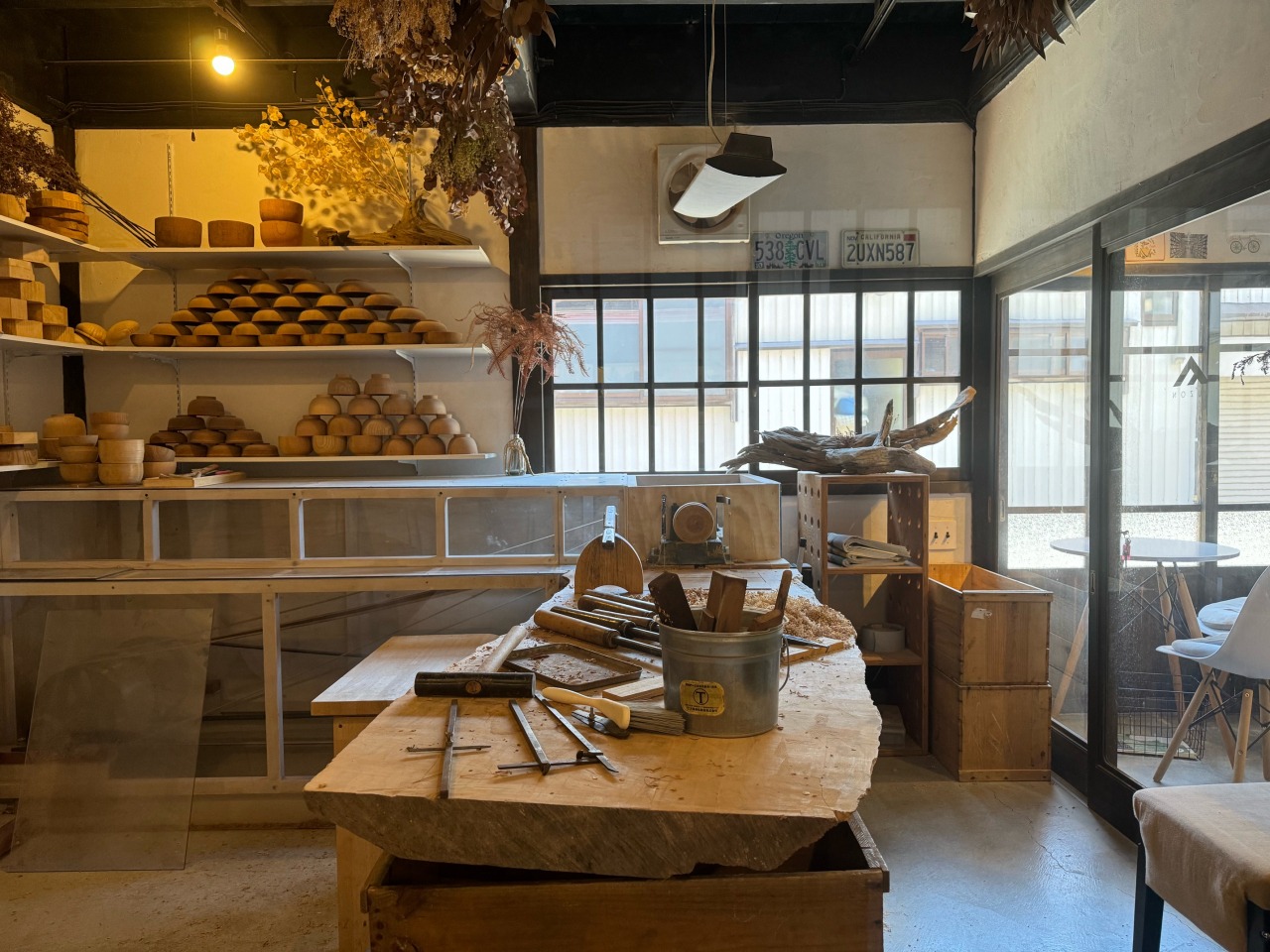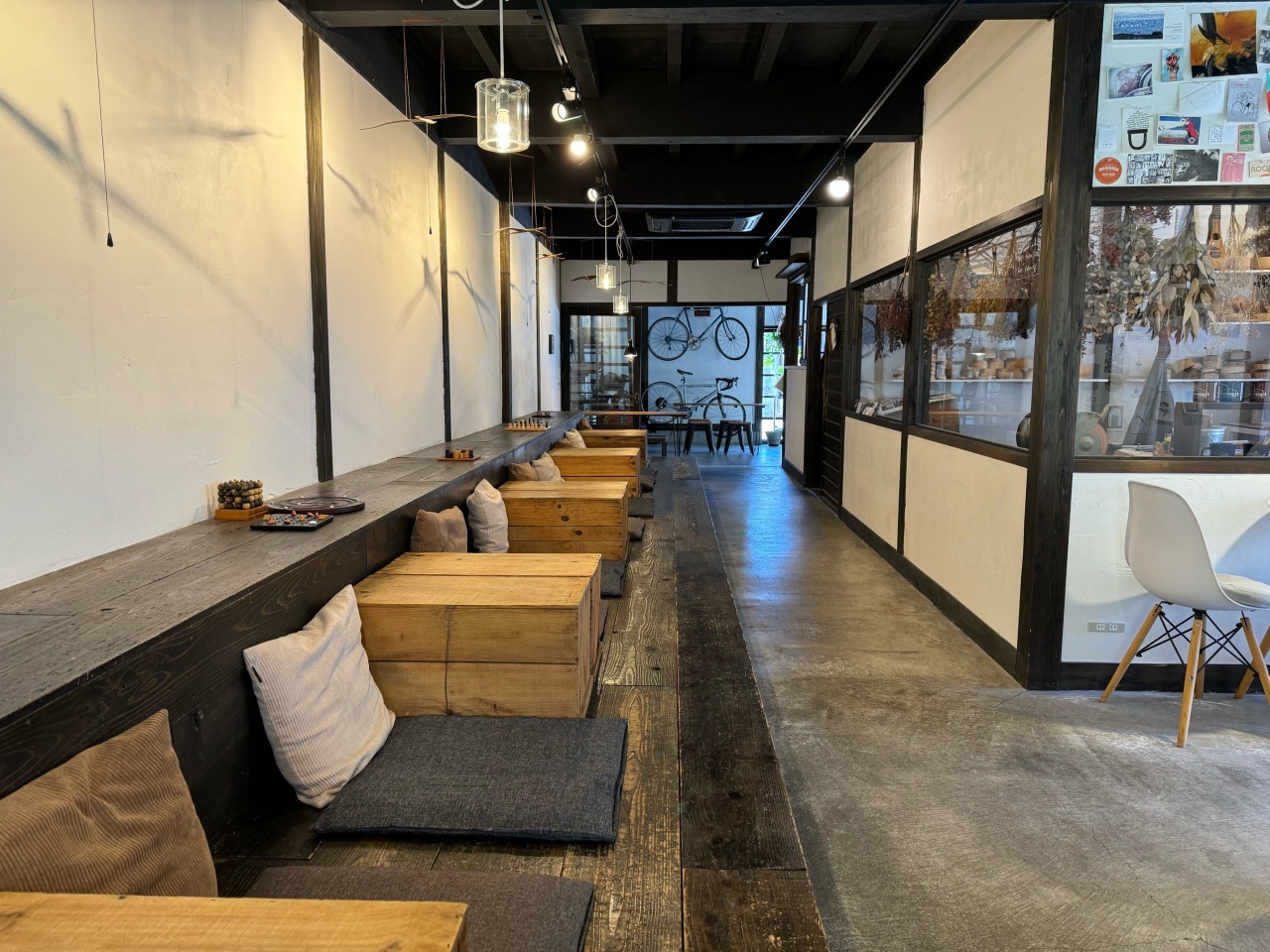 古材を再利用した長い小上がりから見える、漆器の木地工房を眺めながら飲食をお楽しみください。