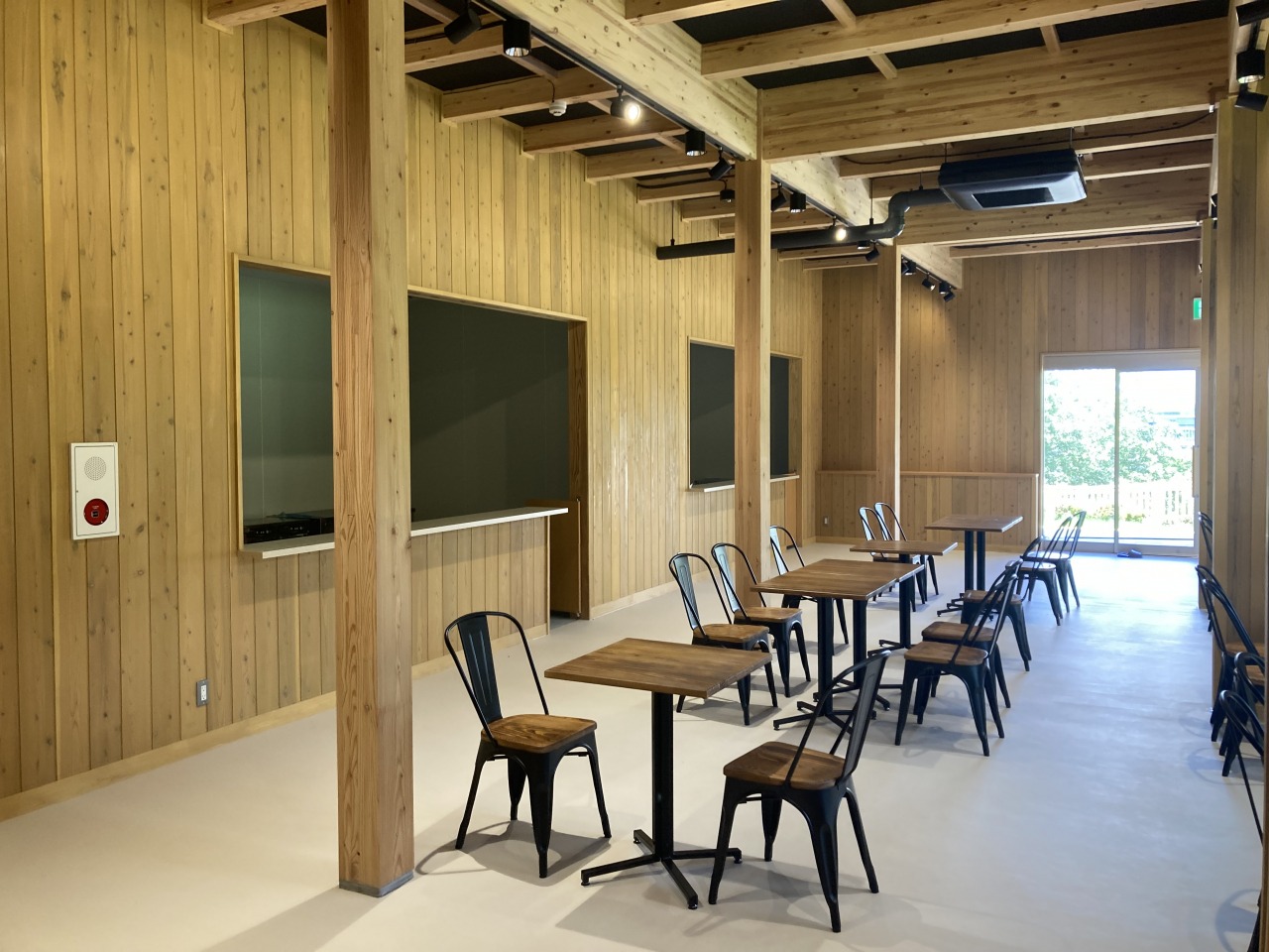 園内の拠点施設「あいうえお学舎」では、無料休憩所「もりのテラス」でカフェや地元産品の販売、2階は天候に左右されない無料の木遊具施設「もりの遊房(あそぼ)」があります。