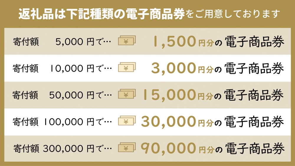 10,000円の寄付 →   3,000円分の電子商品券  家族でのカフェタイムや観光施設の体験チケットに
