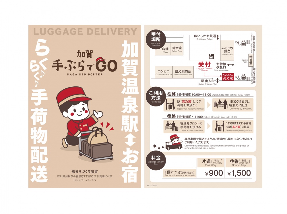 【往路】 10:00~13:00 加賀温泉駅構内「Cafe&Bar 高乃蔵」にて受付 ⇒ 15:00頃までに宿泊先に配送